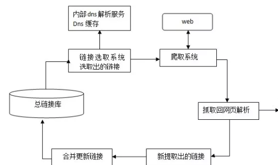 下图为spider抓取系统的基本框架图,其中包括链接存储系统、链接选取系统、dns解析服务系统、抓取调度系统、网页分析系统、链接提取系统、链接分析系统、网页存储系统。Baiduspider即是通过这种系统的通力合作完成对互联网页面的抓取工作。